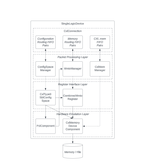 The SingleLogicalDevice class includes three layers, each designed for its effective working. These layers handle different kinds of data packets, adjust device settings, and imitate the physical parts needed for the operations of a CXL Type 3 device. This organized setup ensures the device works as per CXL standards.