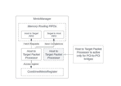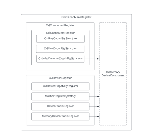 The CombinedMmioRegister class, used in the MmioManager class, is important for handling CXL operations in CXL Type 3 devices. These are shown to the device's base address registers (BARs), allowing device configurations through memory requests to the addresses shown by the BARs.