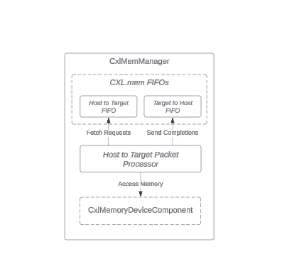 The CxlMemManager class deals with CXL.mem packets, important for reaching host-managed device memories in CXL type 3 devices. It works with the CxlMemoryDeviceComponent class, changing CXL.mem operations into actions that access memories in the CxlMemoryDeviceComponent class.