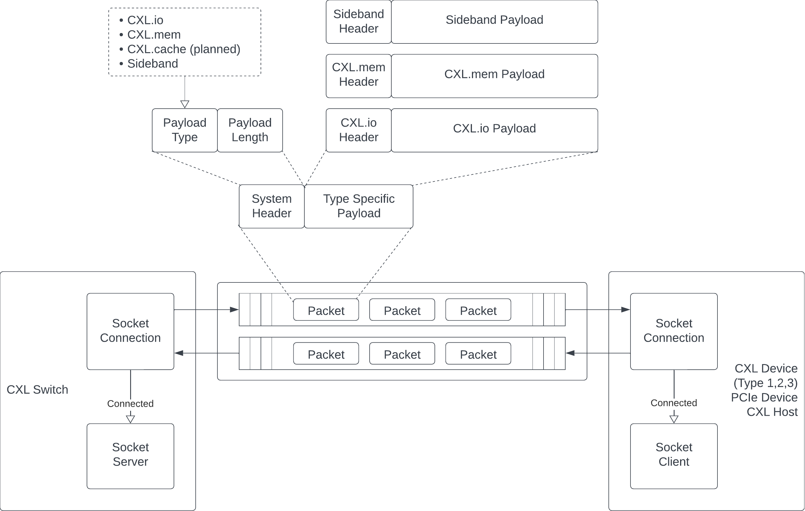 Below is an illustration showing the structure of CXL transaction layer packets and the interaction among CXL components using these packets through a TCP socket.